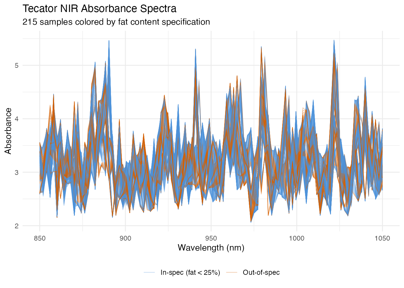 The Tecator dataset from the fda.usc package contains 215 near-infrared (NIR) absorbance spectra measured at 100 wavelengths between 850 and 1050 nm. Each sample has an associated fat percentage. We treat samples with fat content below 25% as “in-specification” (normal production) and the rest as out-of-spec.