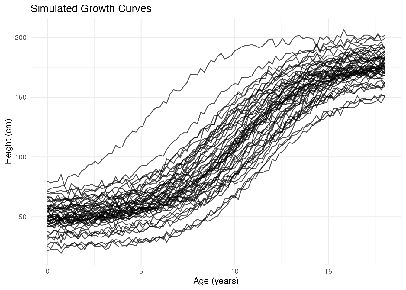 labs(x = "Age (years)", y = "Height (cm)", title = "Simulated Growth Curves")
