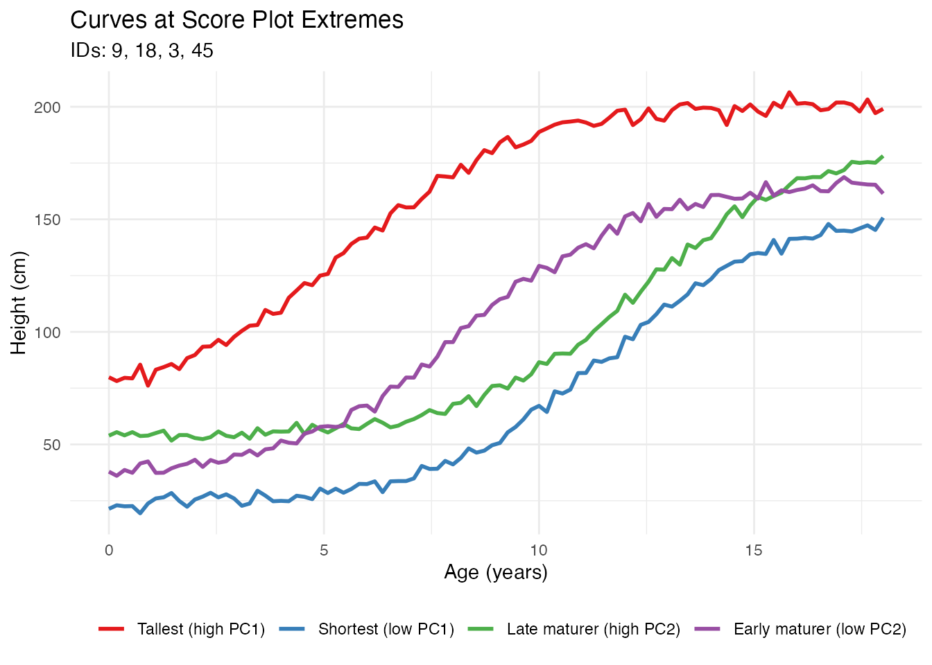- PC2: Growth timing (earlier vs later maturation)