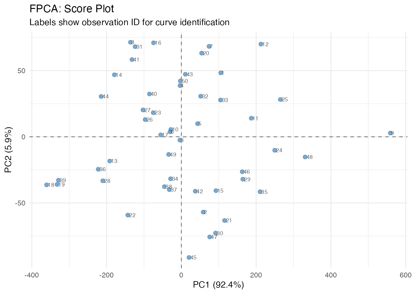The scores show where each observation falls in PC space. Each point is labeled with its observation ID, allowing you to identify specific curves of interest:
