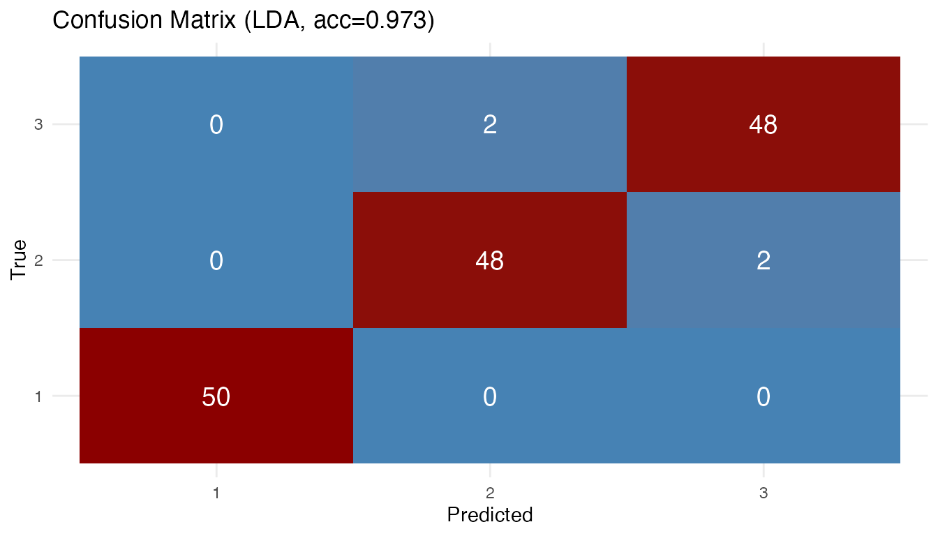 #> dd DD 0.840Training accuracy alone can be misleading — QDA and kNN may overfit. Cross-validation gives a fairer picture (see below).