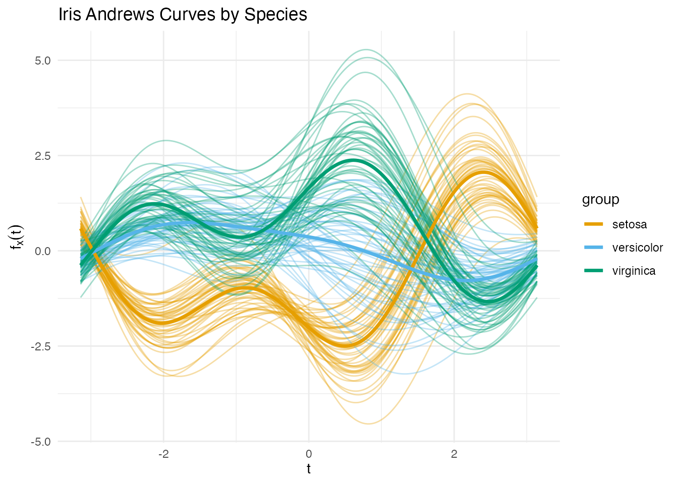 Instead of a toy simulation we use the classic iris dataset, transformed into functional data via the Andrews transformation. This maps each 4-dimensional observation to a curve on using a Fourier expansion — preserving Euclidean distances up to a constant factor.