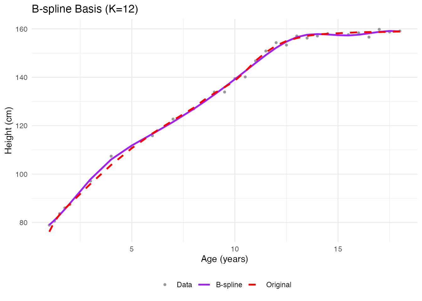 labs(x = "Age (years)", y = "Height (cm)", title = "B-spline Basis (K=12)",