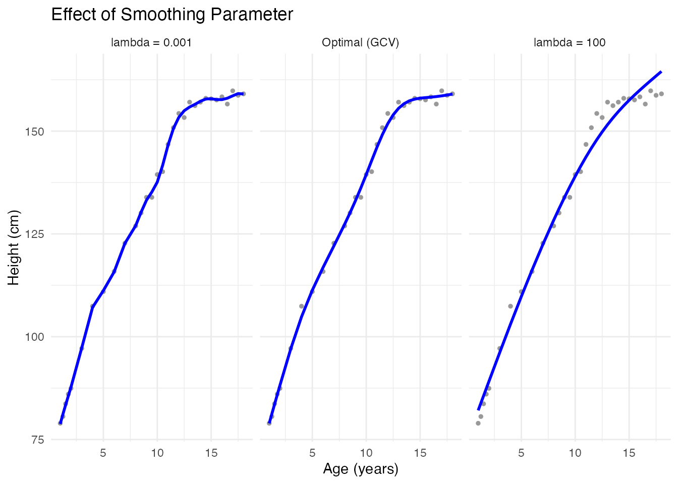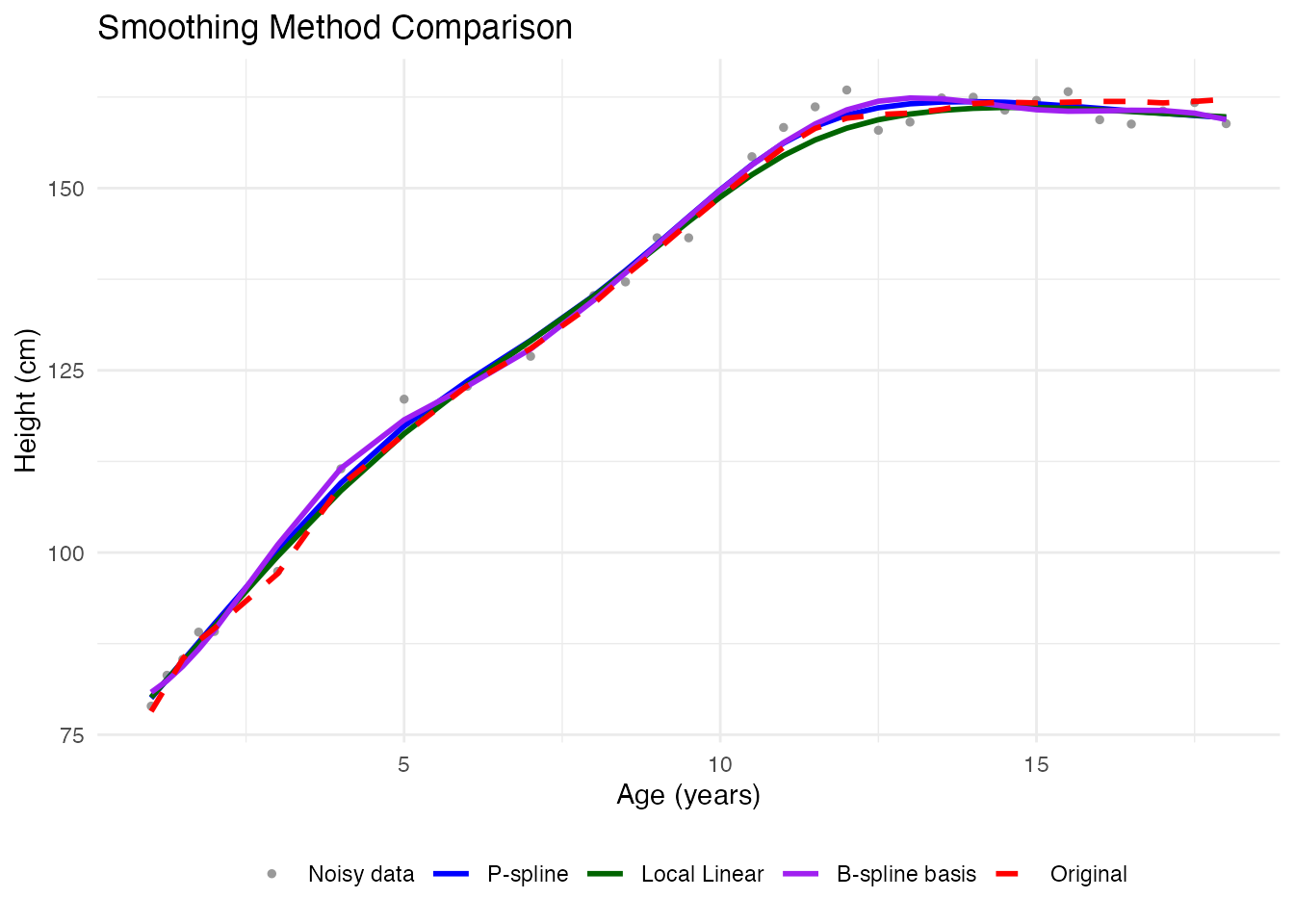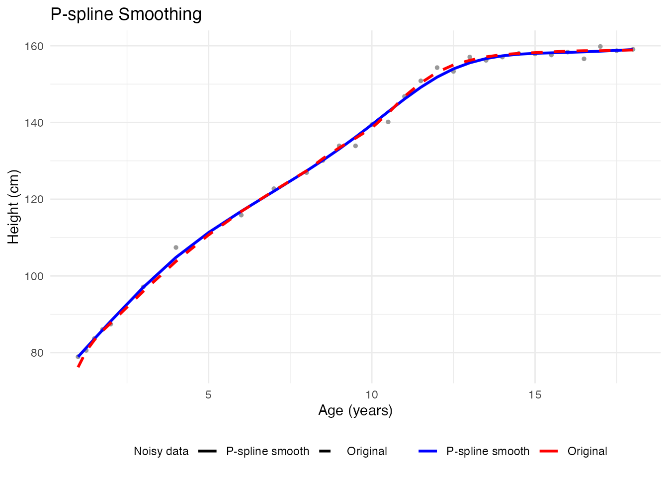 labs(x = "Age (years)", y = "Height (cm)", title = "P-spline Smoothing",