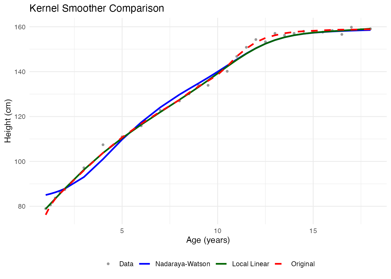 title = "Kernel Smoother Comparison", color = NULL, linetype = NULL) +
