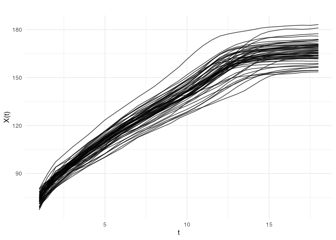 #> Dataset: 54 growth curves measured at 31 agesVisualizing the Raw Data