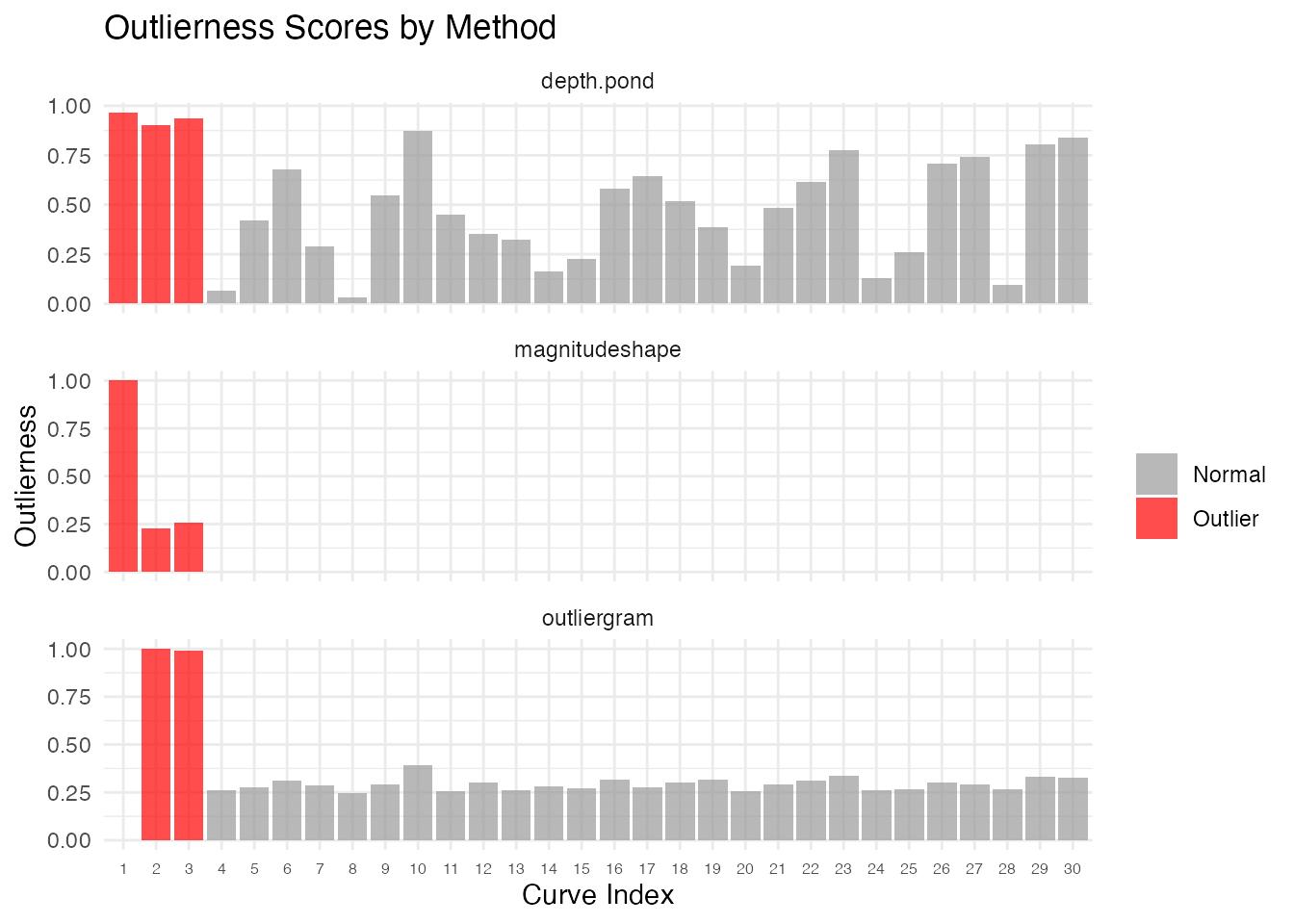 Outlier detection in functional data identifies curves that are atypical or anomalous compared to the rest of the sample. fdars provides several methods based on functional depth and likelihood ratio tests.
