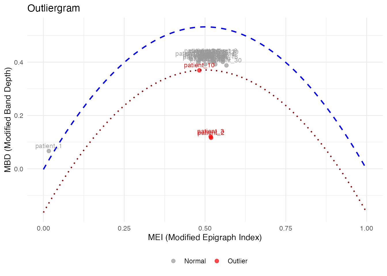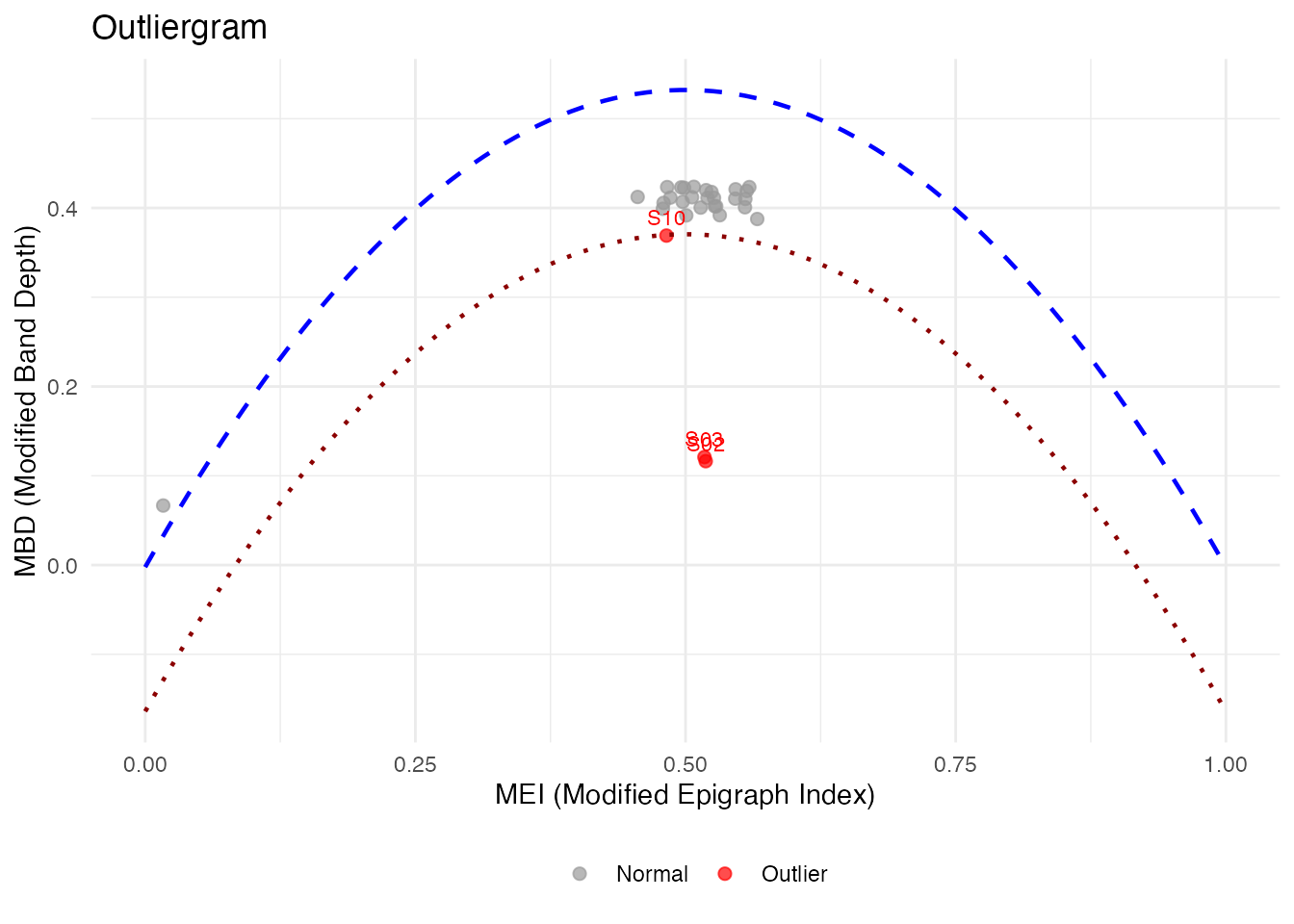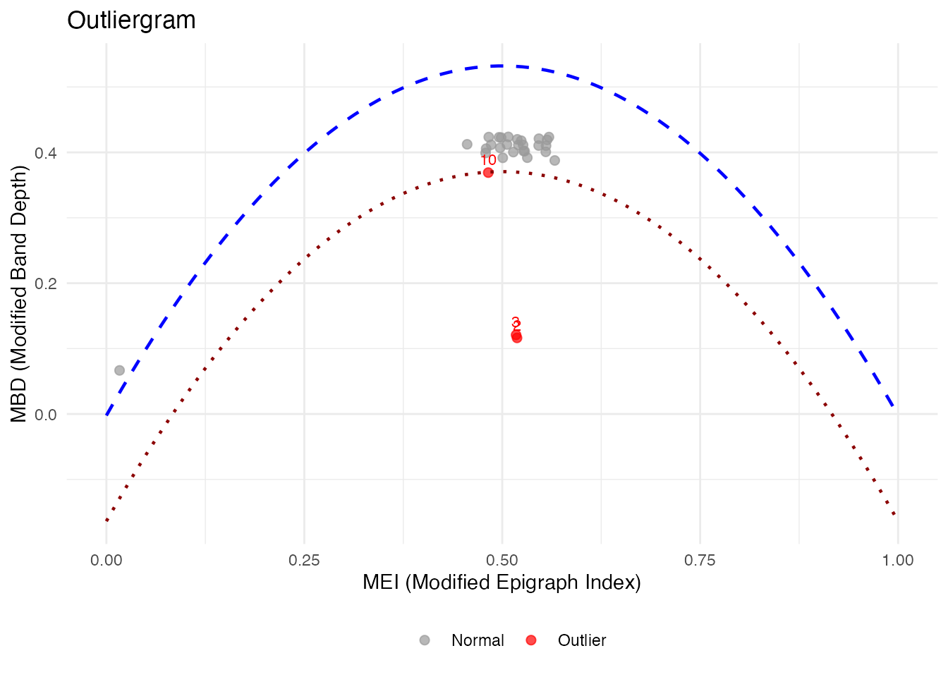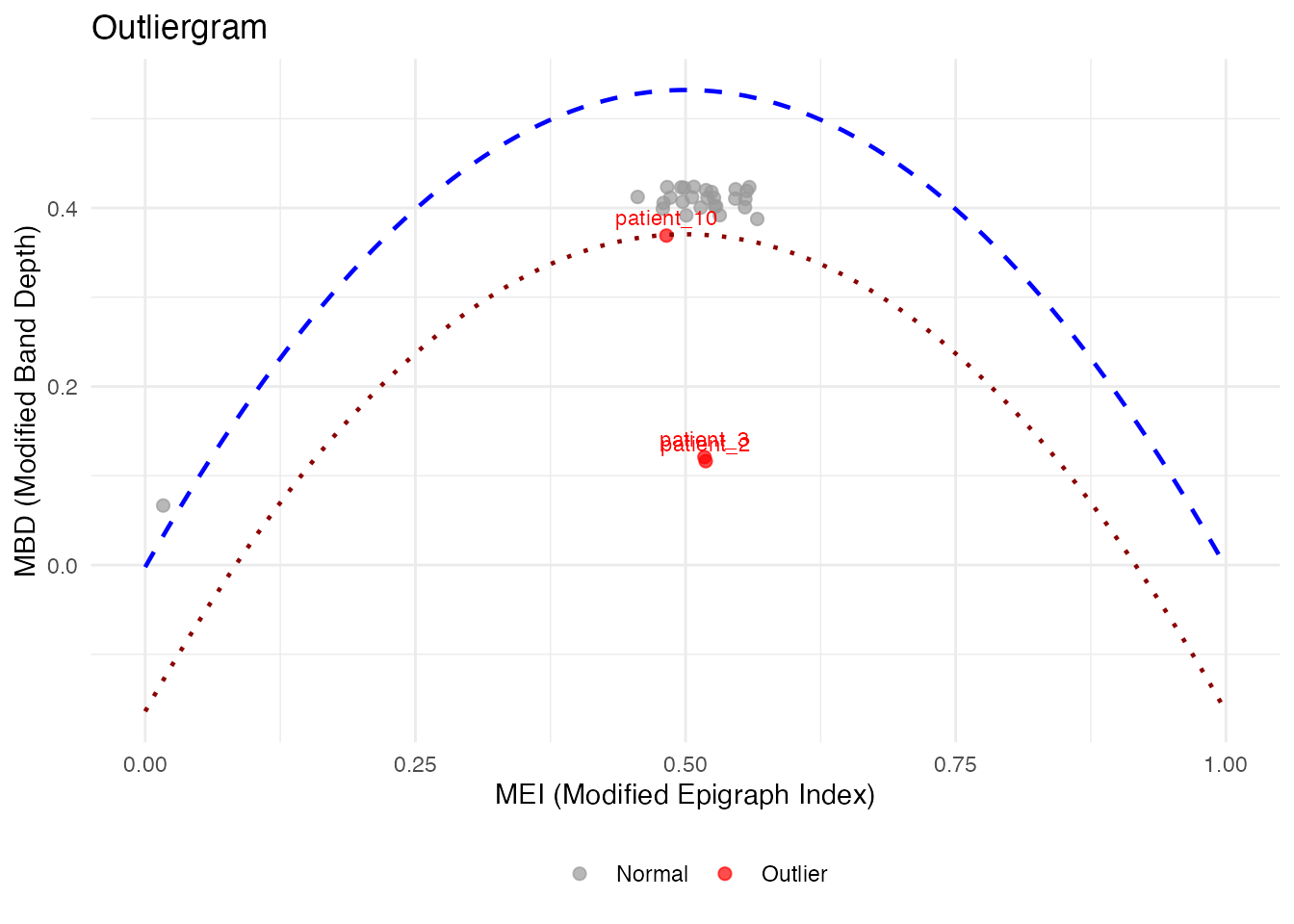 The outliergram plots the Modified Epigraph Index (MEI) against Modified Band Depth (MBD):