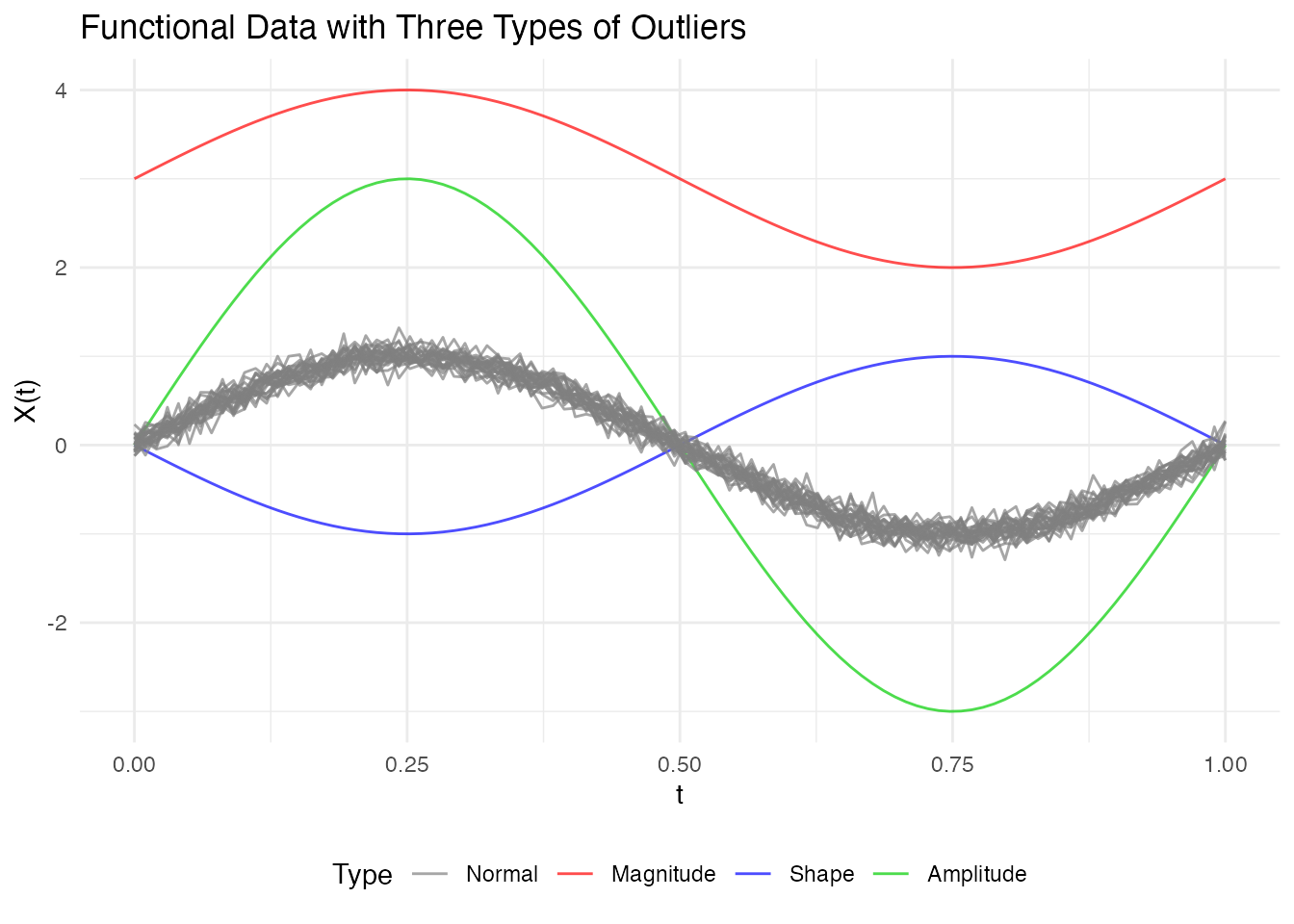 X[3, ] <- 3 * sin(2 * pi * t_grid) # AMPLITUDE outlier (larger scale)