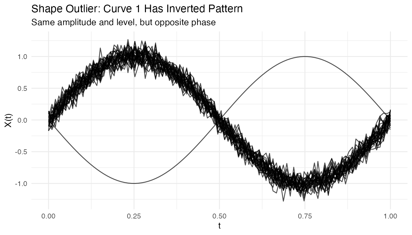 X[2, ] <- -sin(2 * pi * t_grid) # SHAPE outlier (inverted pattern)