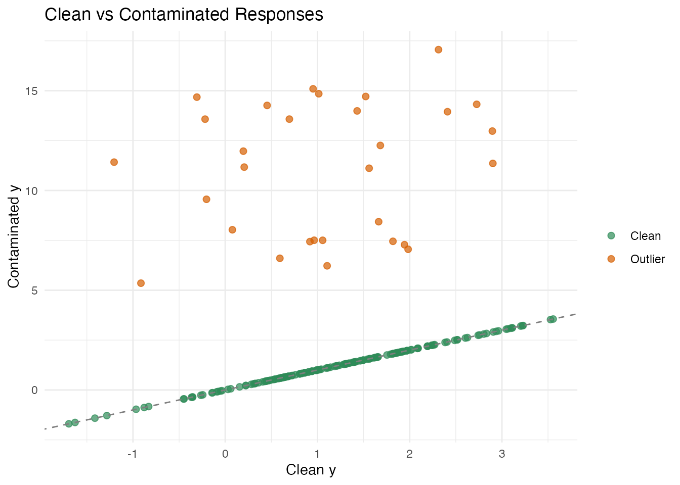 #> OLS R-squared (contaminated): 0.0761On clean data, OLS performs well (R² > 0.9). On contaminated data, the 30 one-sided outliers systematically bias the coefficient estimates, inflating the residuals for all observations — even the clean ones. This is the hallmark of OLS fragility: outliers have unbounded influence.