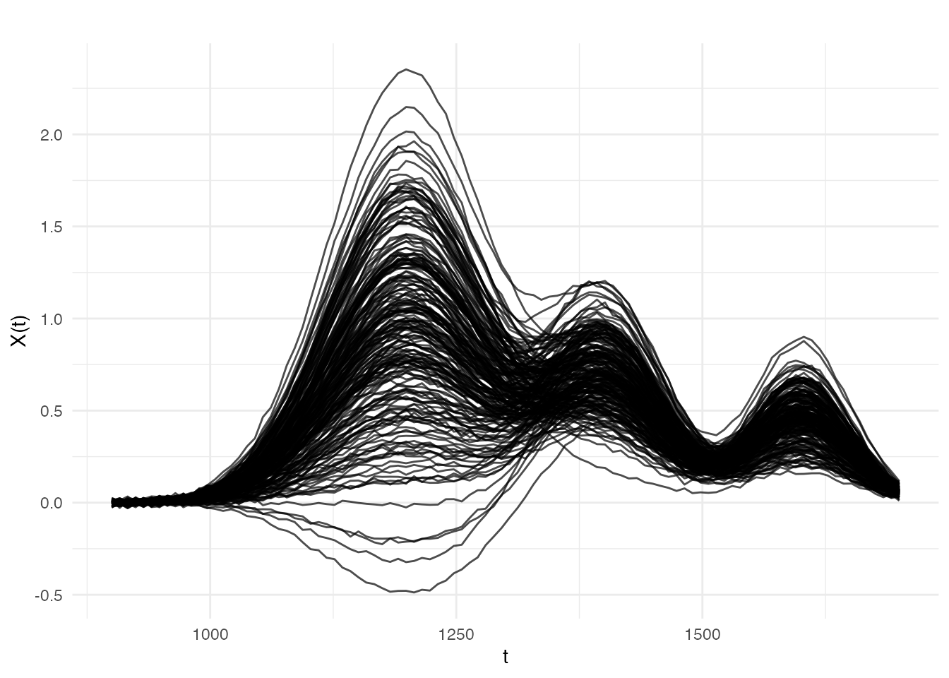 X[i, ] <- amp1[i] * dnorm(t_grid, 1200, 80) * 200 +