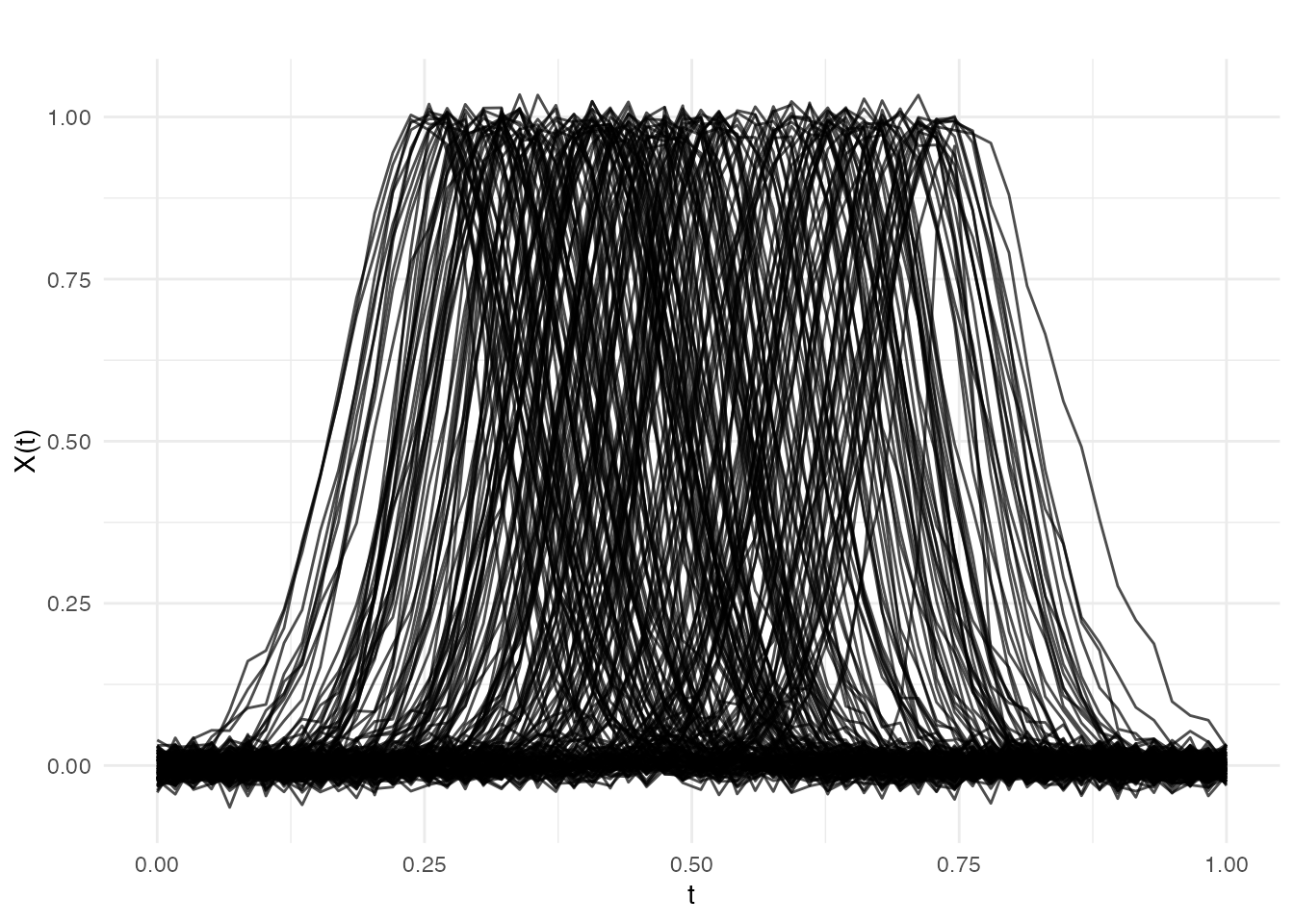 Note how the bumps are located at different positions along the time axis — this is phase variation. The response depends only on bump width, a shape feature that standard FPCA mixes with phase.