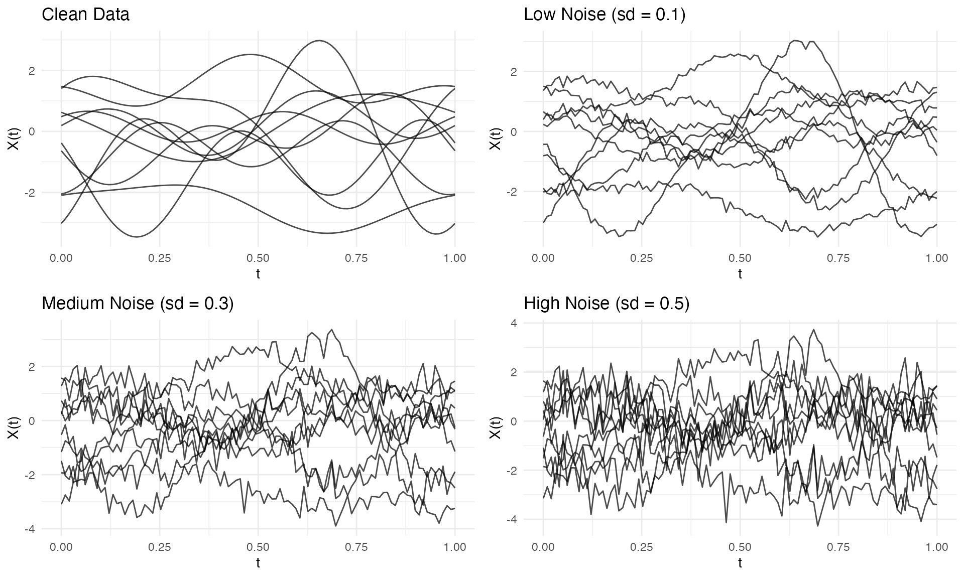 fd <- simFunData(n = 10, argvals = t, M = 5, seed = 42)