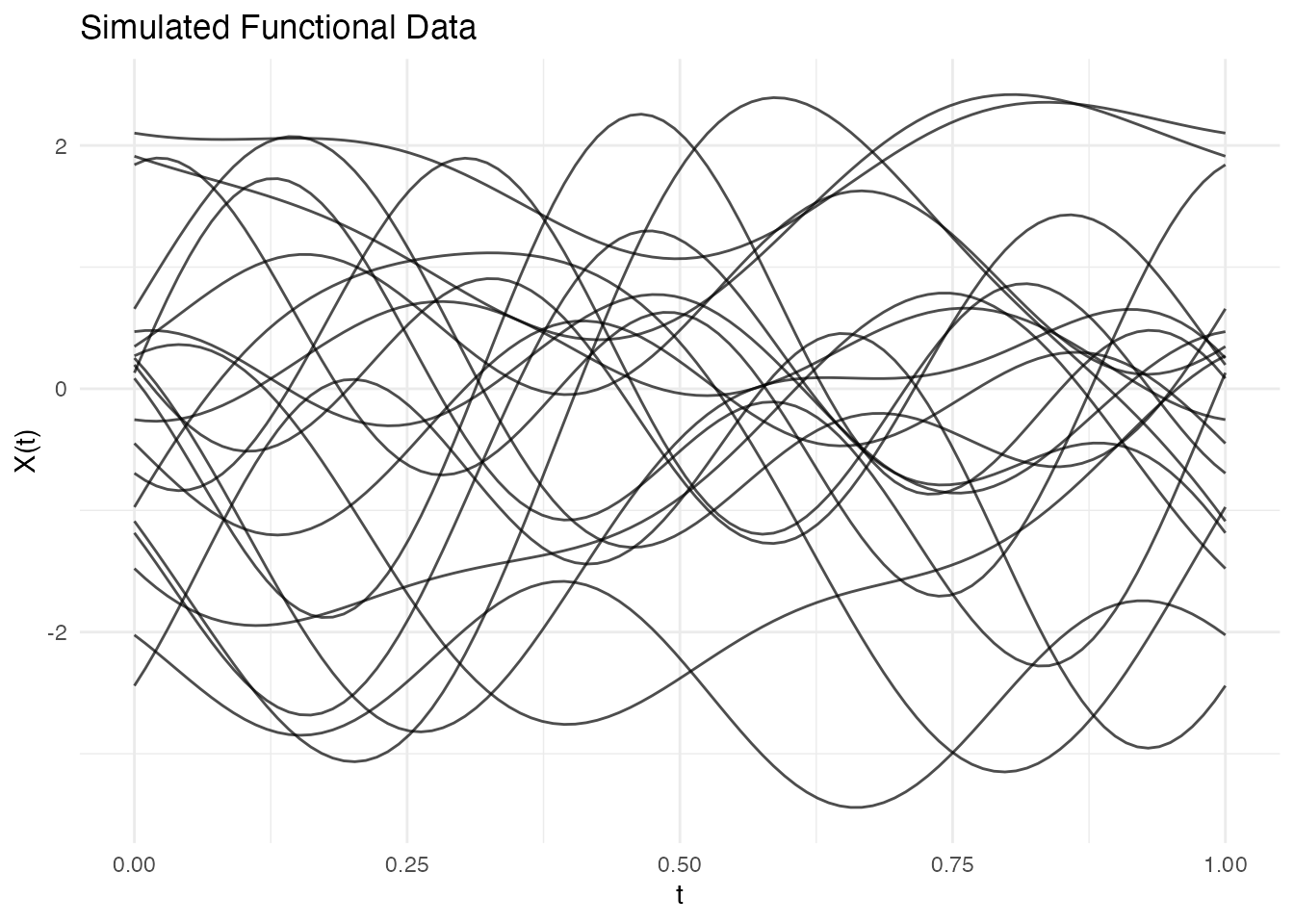 fd <- simFunData(n = 20, argvals = t, M = 5, seed = 42)