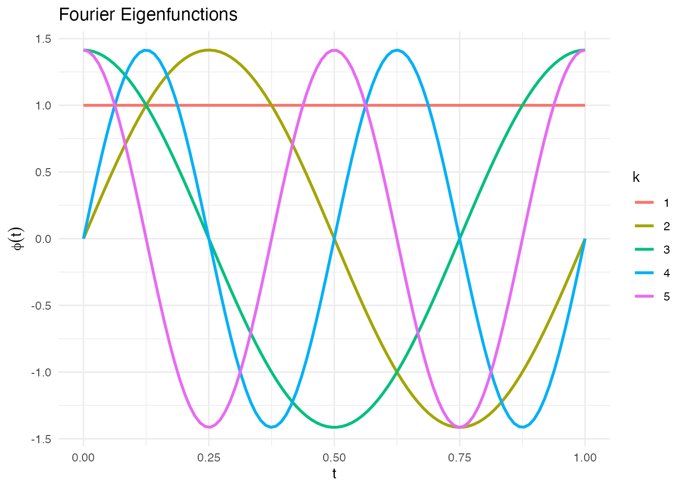 labs(title = "Fourier Eigenfunctions", x = "t", y = expression(phi(t)), color = "k") +