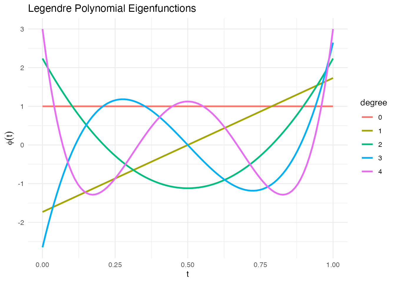 labs(title = "Legendre Polynomial Eigenfunctions", x = "t", y = expression(phi(t))) +