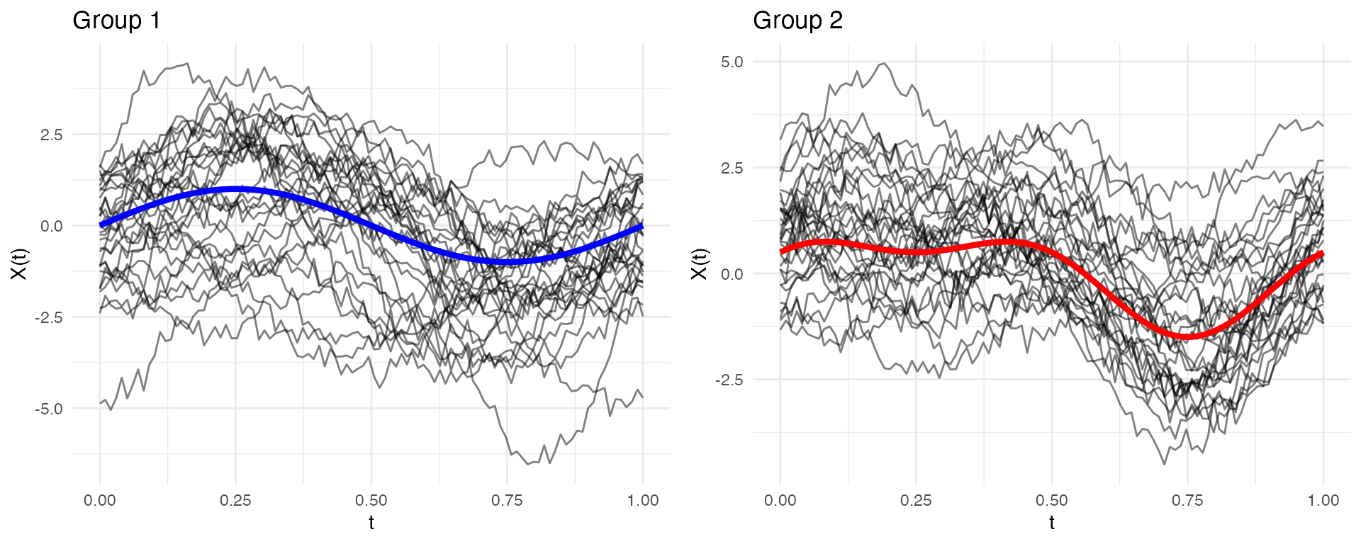 group2 <- simFunData(n = n_per_group, argvals = t, M = 5, mean = mean_group2)