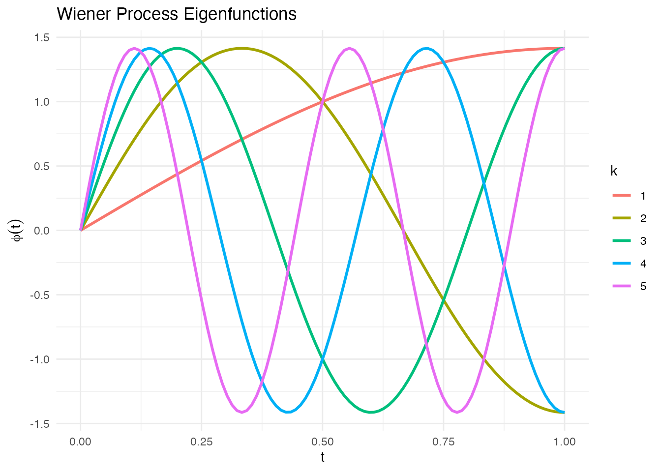 labs(title = "Wiener Process Eigenfunctions", x = "t", y = expression(phi(t)), color = "k") +