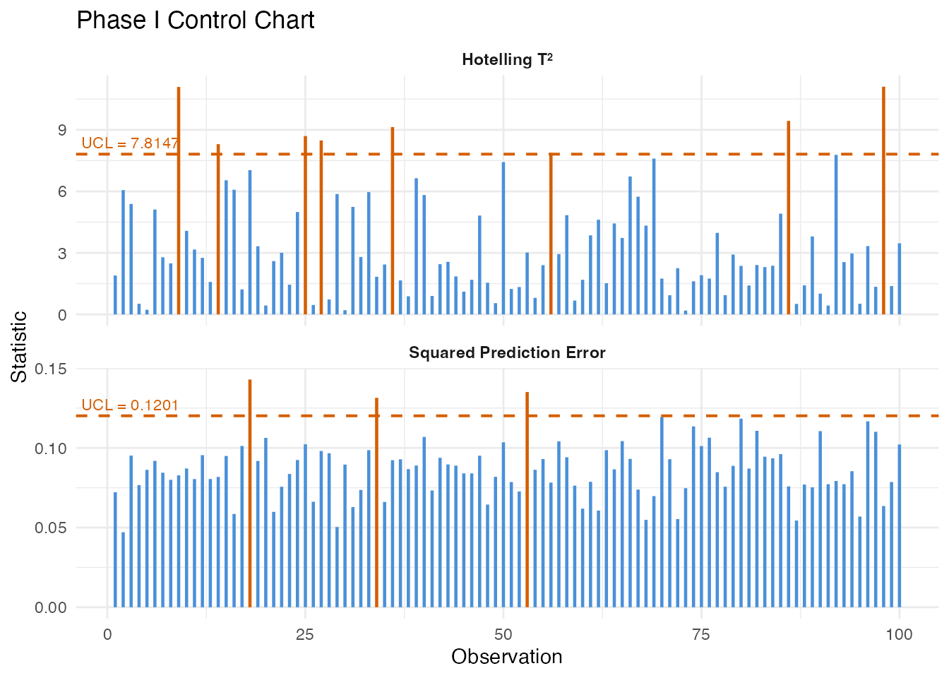 - Phase I statistics — and SPE for each training observation (useful for checking that Phase I data is truly in-control)