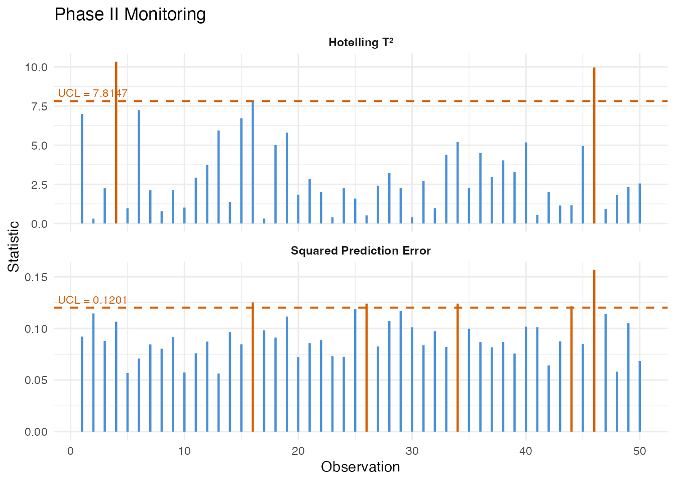 Phase II — Monitor new observations by projecting onto the Phase I principal components and comparing statistics to the control limits. Alarms fire when a statistic exceeds its Upper Control Limit (UCL).