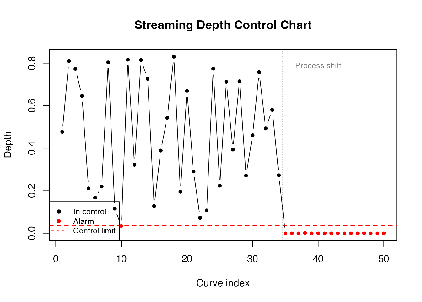 #> First alarm: 10 (shift at 35 )The depth chart detects the process shift shortly after it occurs. Unlike univariate control charts, this approach monitors the entire curve shape simultaneously.