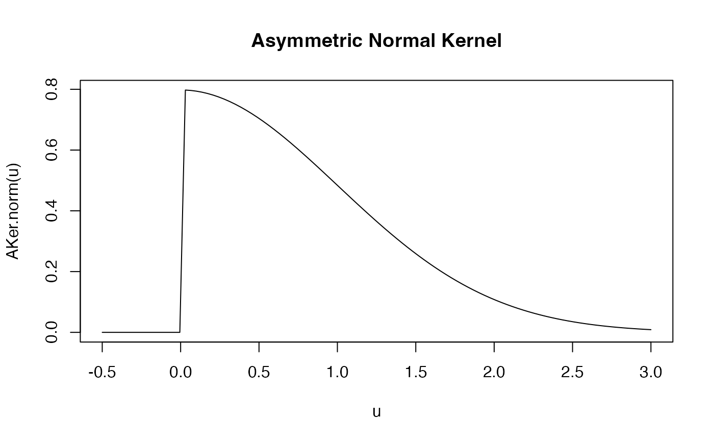 u <- seq(-0.5, 3, length.out = 100) plot(u, AKer.norm(u), type = "l", main = "Asymmetric Normal Kernel")