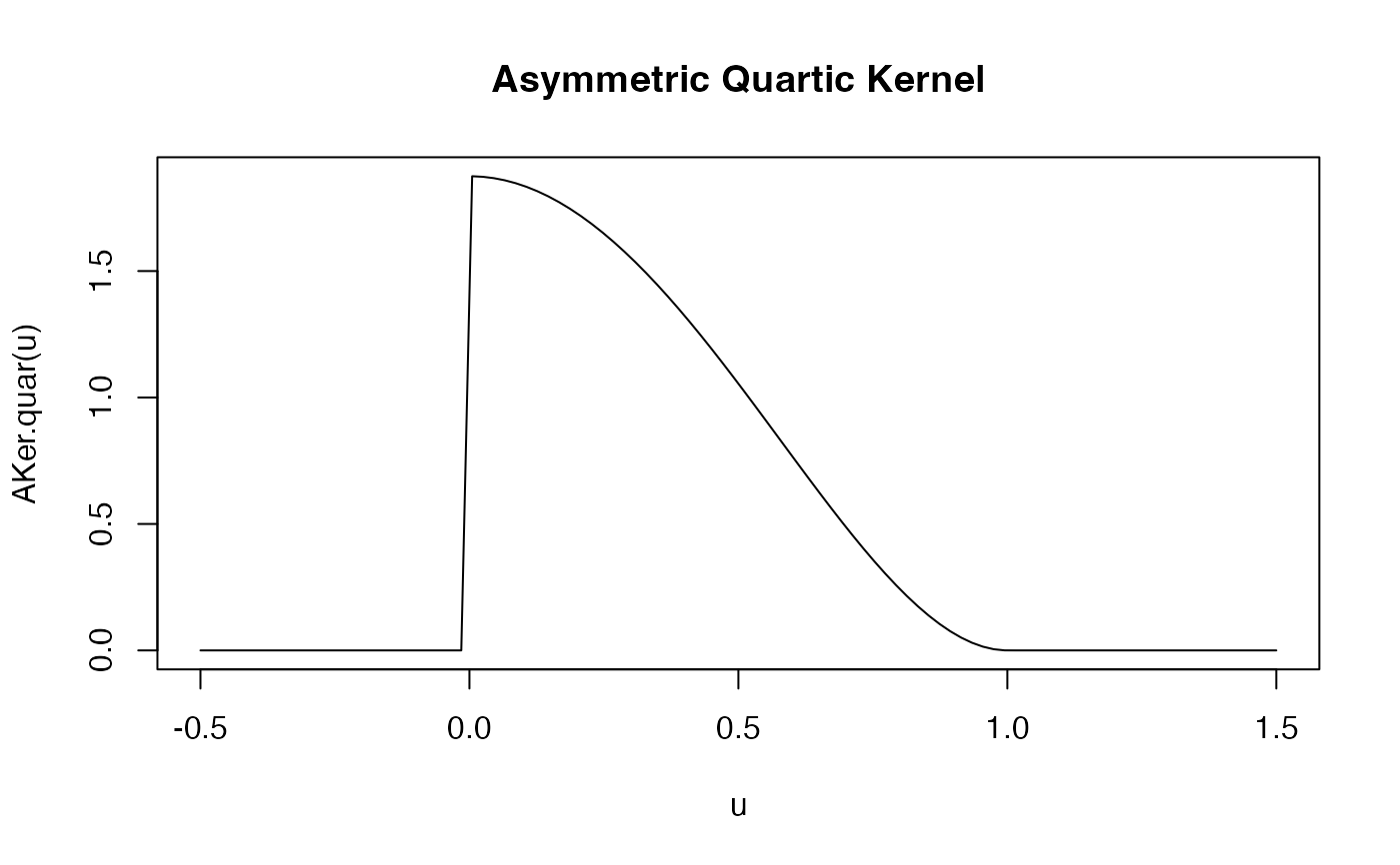 u <- seq(-0.5, 1.5, length.out = 100) plot(u, AKer.quar(u), type = "l", main = "Asymmetric Quartic Kernel")