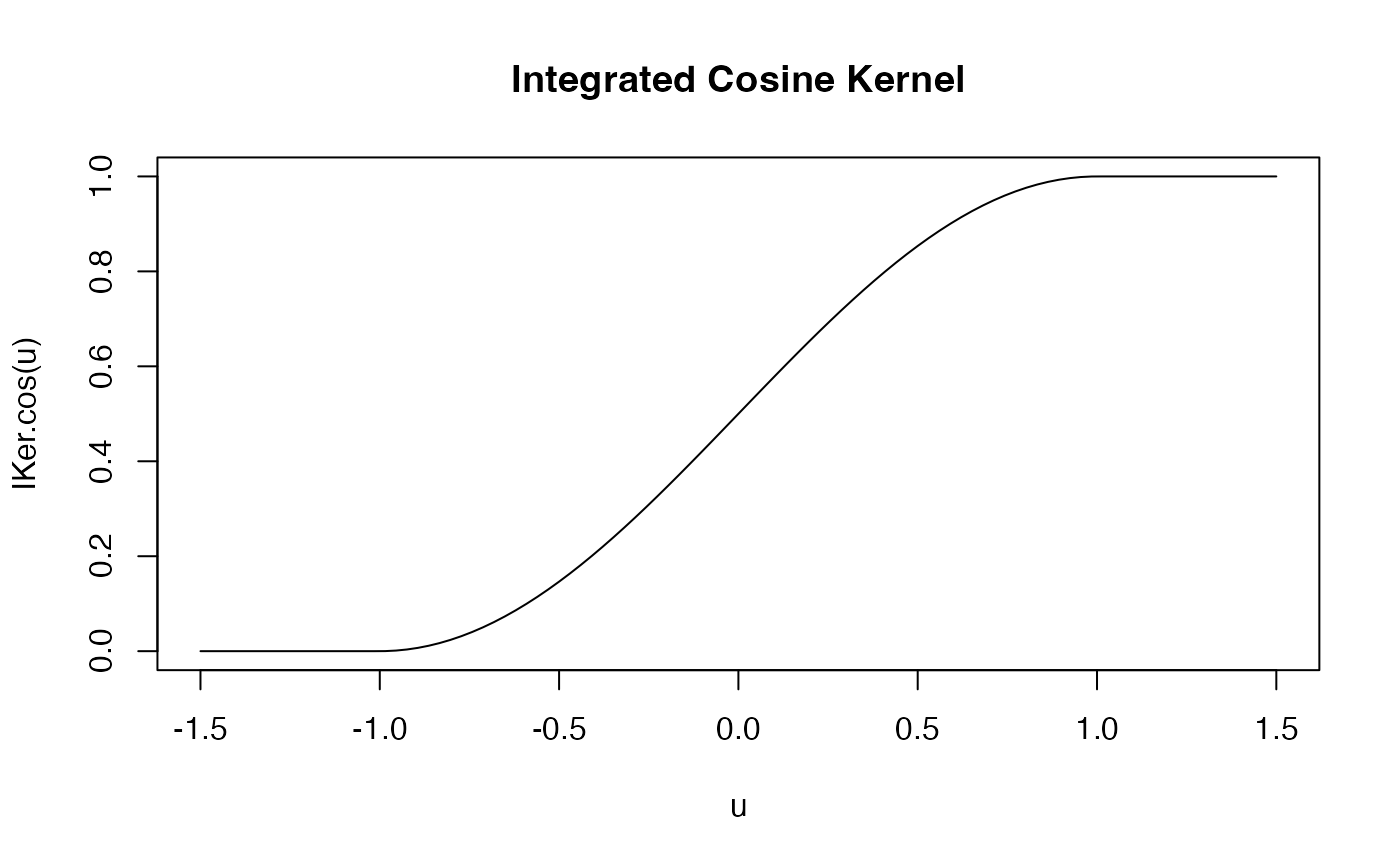 u <- seq(-1.5, 1.5, length.out = 100) plot(u, IKer.cos(u), type = "l", main = "Integrated Cosine Kernel")