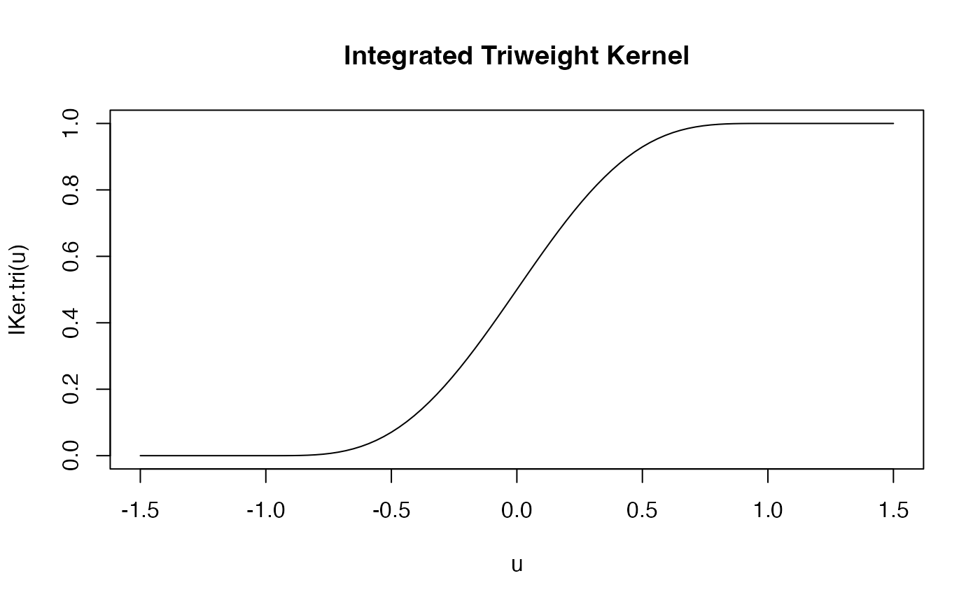 u <- seq(-1.5, 1.5, length.out = 100) plot(u, IKer.tri(u), type = "l", main = "Integrated Triweight Kernel")