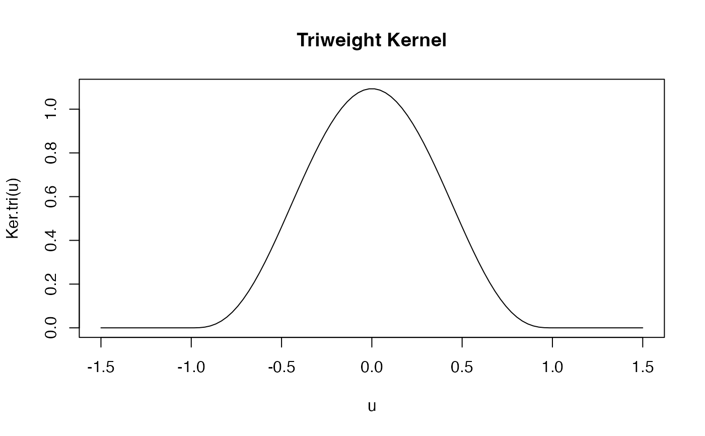 u <- seq(-1.5, 1.5, length.out = 100) plot(u, Ker.tri(u), type = "l", main = "Triweight Kernel")
