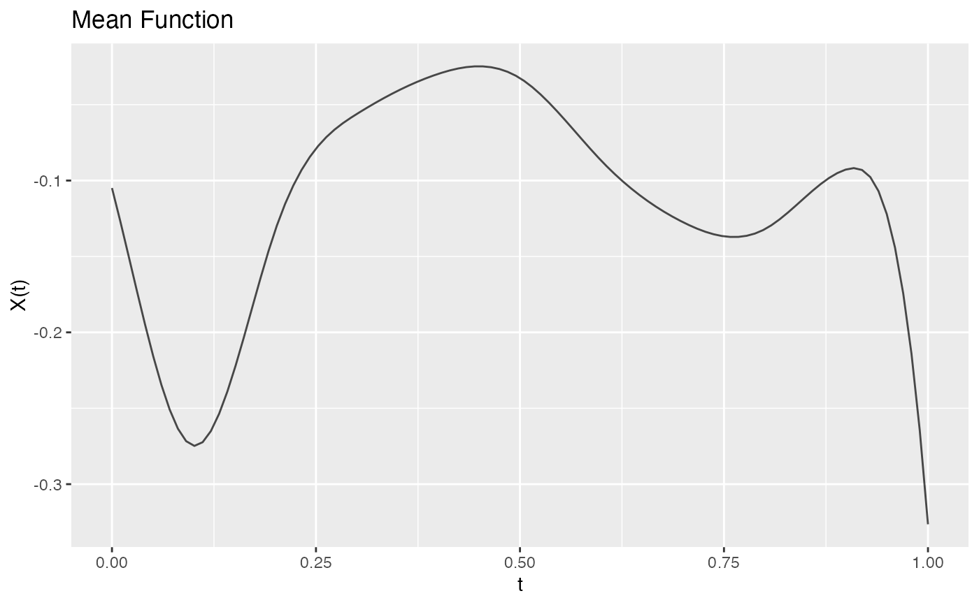 fd <- simFunData(n = 50, argvals = t, M = 5, seed = 42)