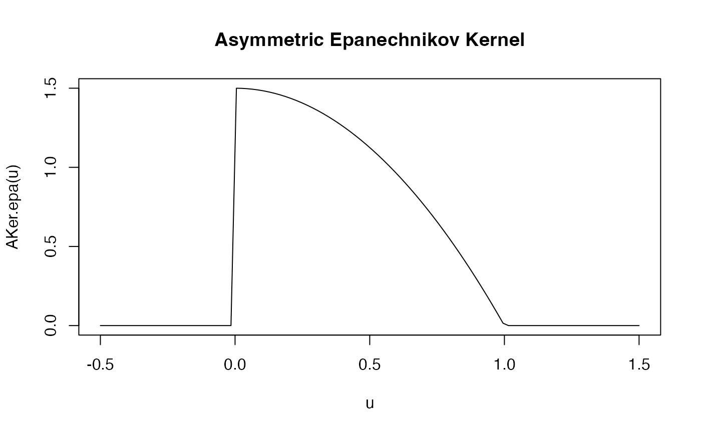 u <- seq(-0.5, 1.5, length.out = 100) plot(u, AKer.epa(u), type = "l", main = "Asymmetric Epanechnikov Kernel")