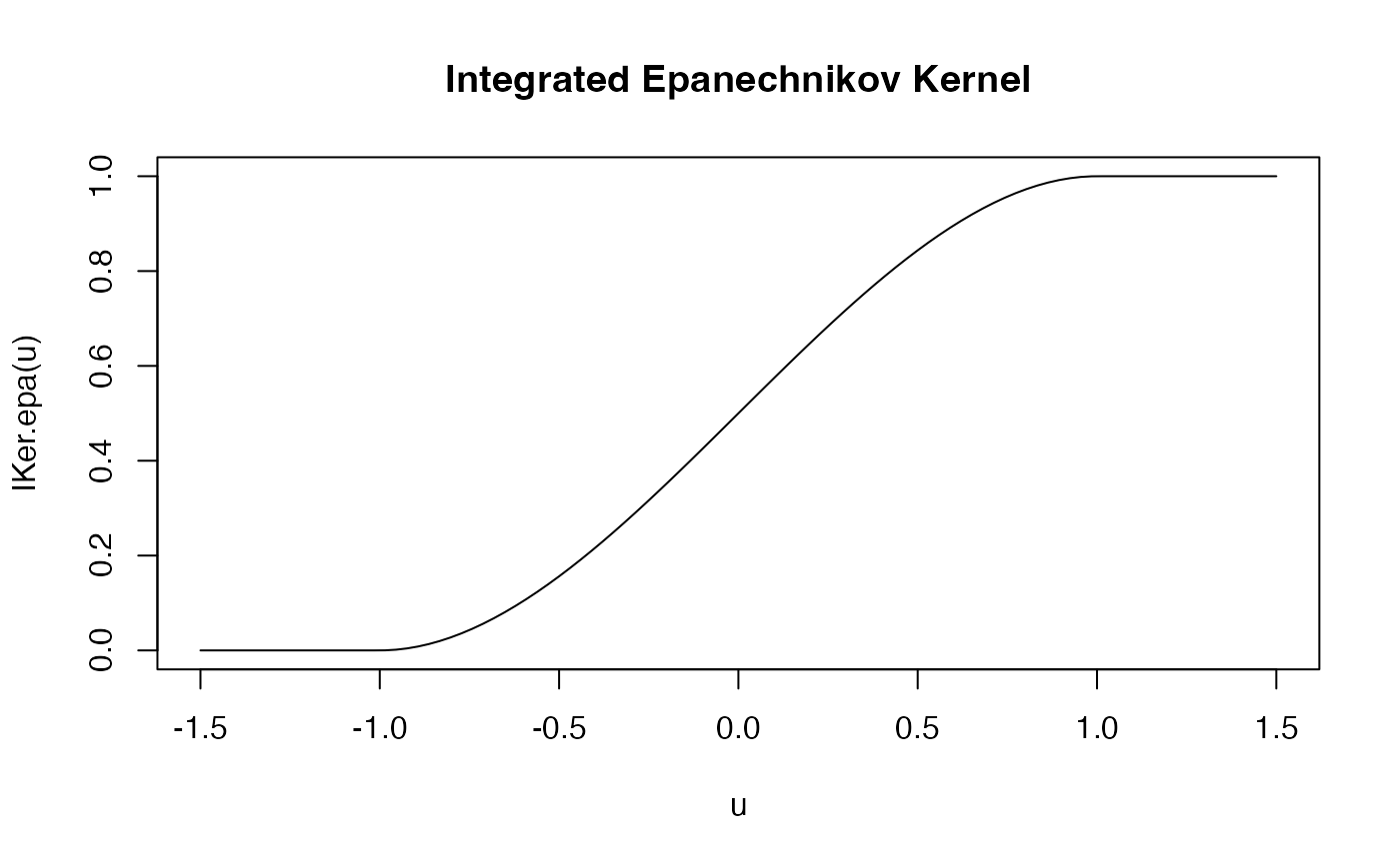 u <- seq(-1.5, 1.5, length.out = 100) plot(u, IKer.epa(u), type = "l", main = "Integrated Epanechnikov Kernel")