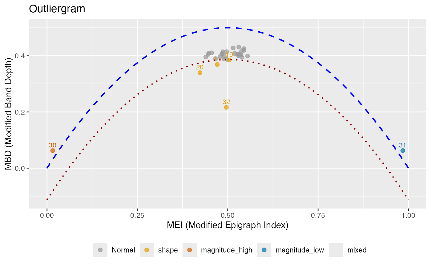 Creates an outliergram plot that displays MEI (Modified Epigraph Index) versus MBD (Modified Band Depth) for outlier detection. Points below the parabolic boundary are identified as outliers, and each outlier is classified by type.