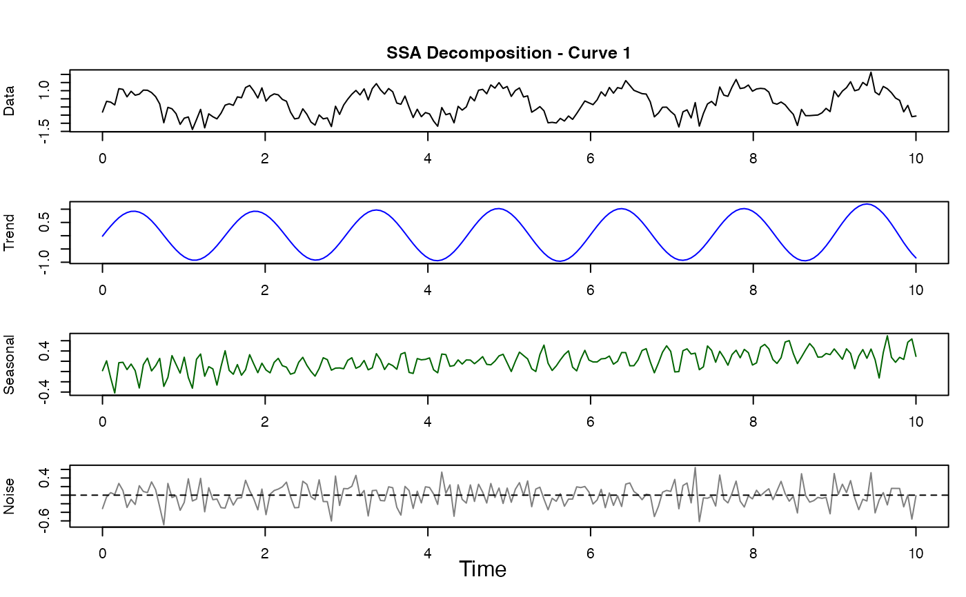 Performs Singular Spectrum Analysis on functional data to decompose each curve into trend, seasonal (oscillatory), and noise components. SSA is a model-free, non-parametric technique based on singular value decomposition of the trajectory matrix.