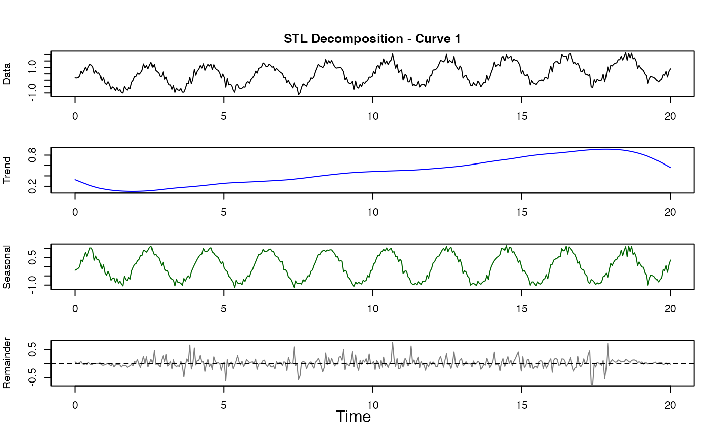 Performs STL (Seasonal and Trend decomposition using LOESS) on functional data following Cleveland et al. (1990). This is a robust iterative procedure that separates a time series into trend, seasonal, and remainder components.